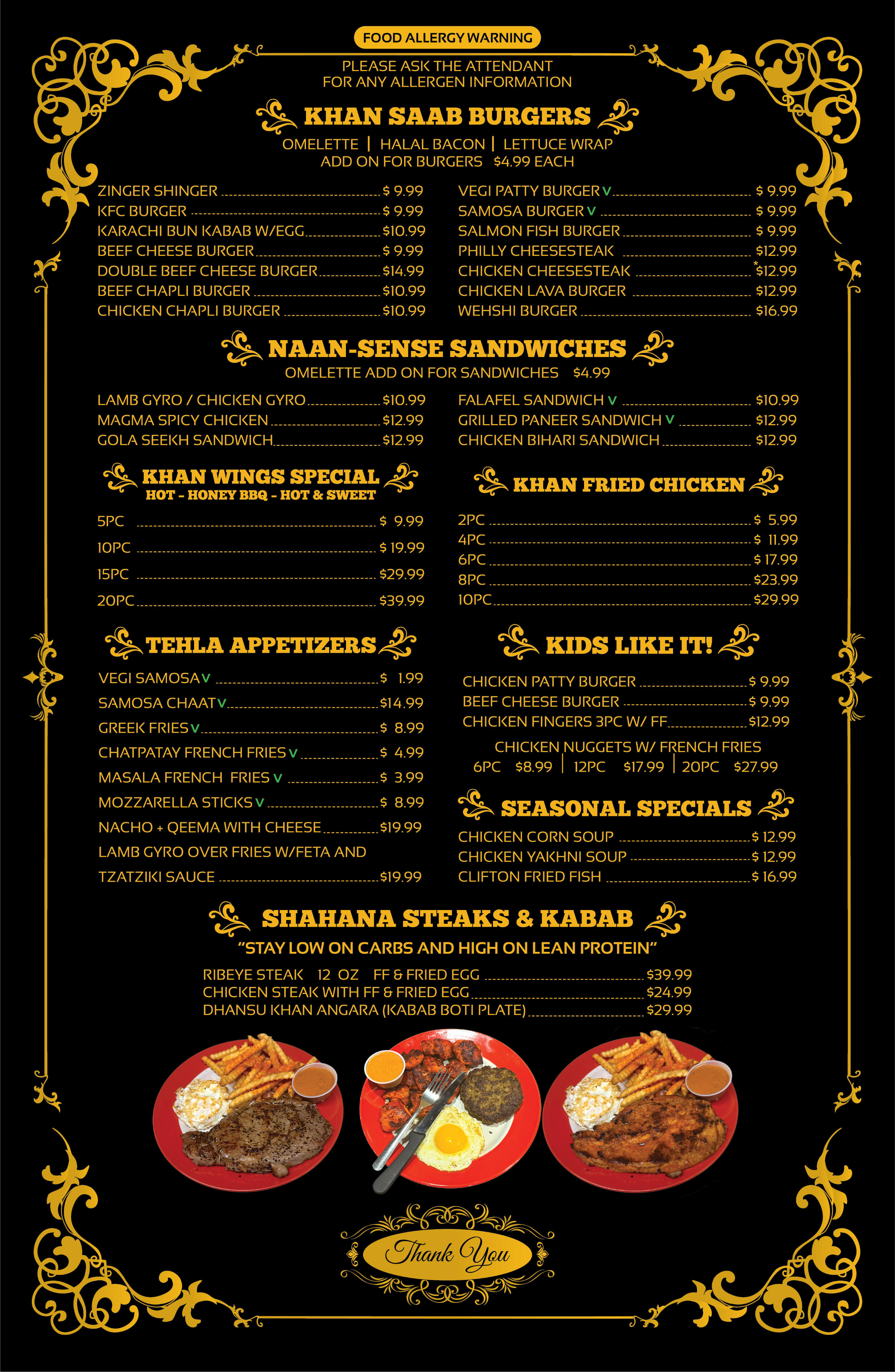 Scroll below to find a list of all of our tasty food! From steaks, burgers, fried chicken and wings to pizza and numerous naan-sense sandwiches , we definitely have something to satisfy your cravings! Everything is cooked fresh, so order ahead to save time!-EVERYTHING IS ZABIHAH HALAL-