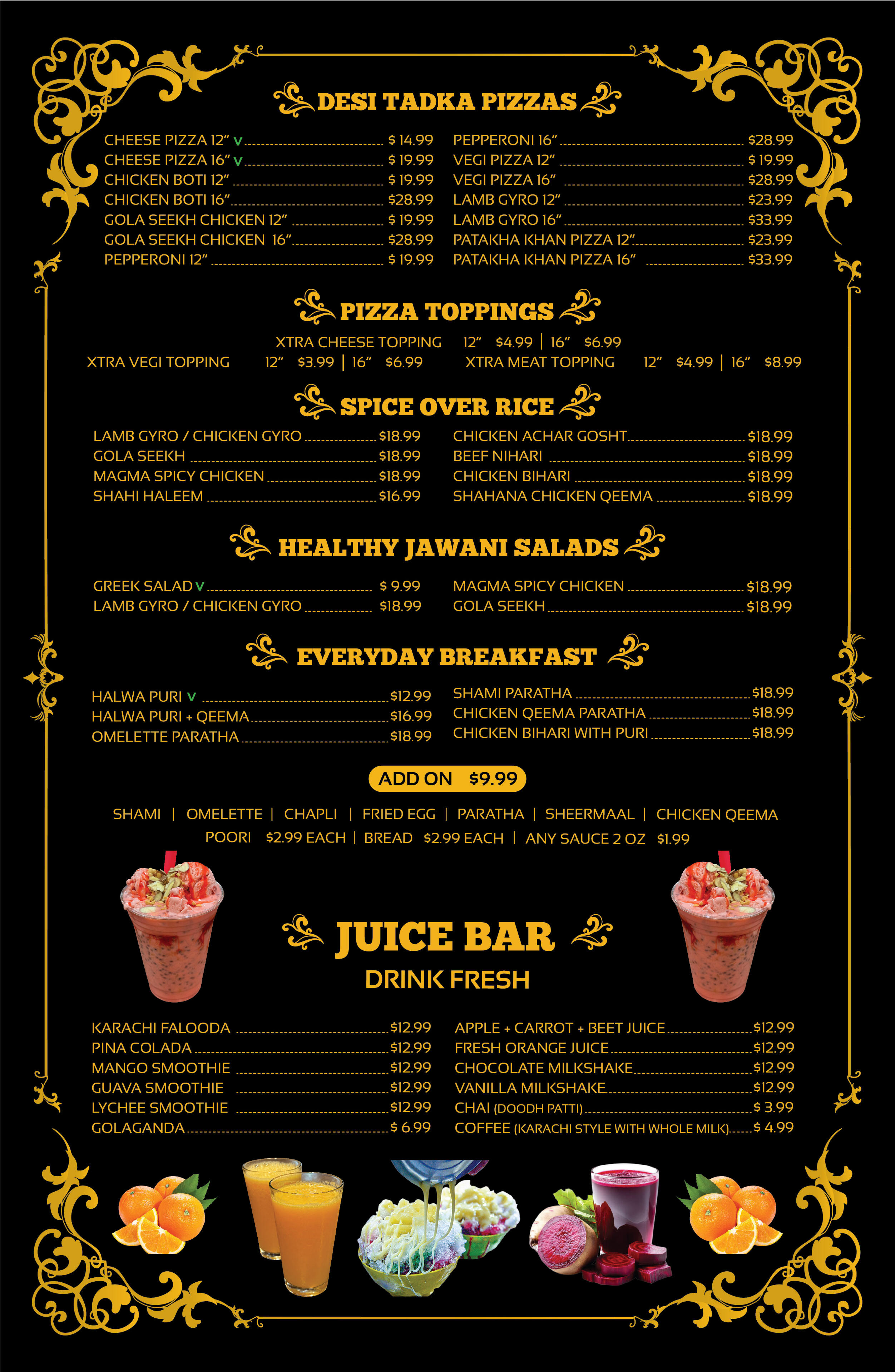 Scroll below to find a list of all of our tasty food! From steaks, burgers, fried chicken and wings to pizza and numerous naan-sense sandwiches , we definitely have something to satisfy your cravings! Everything is cooked fresh, so order ahead to save time!-EVERYTHING IS ZABIHAH HALAL-